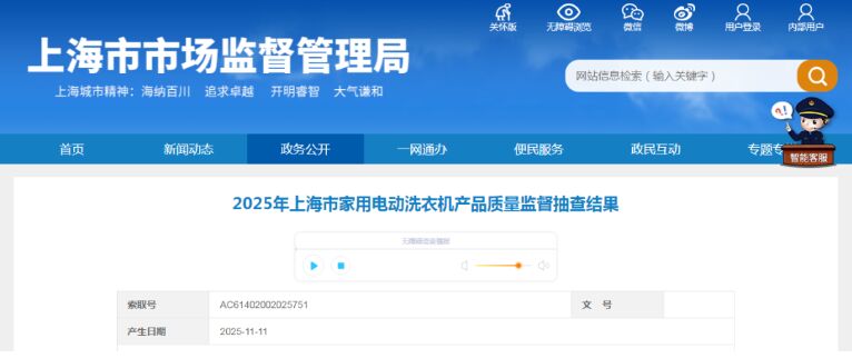 近期,上海市市場監督管理局對本市生產、銷售的家用電動洗衣機產品質量進行了監督抽查。本次抽查了20次產品。經檢驗,未發現不合格。其中生產領域1批次;實體銷售15批次;電商銷售4批次。