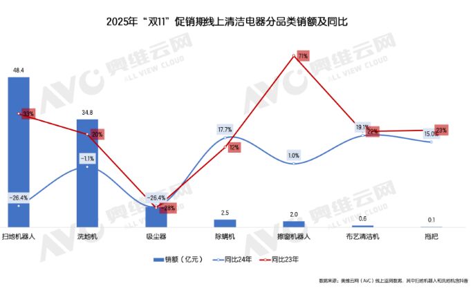 奧維云網(AVC)線上監測數據顯示,2025年“雙11”促銷期(第41周至第46周),清潔電器整體零售額為95億元,同比下滑17%;零售量為528萬臺,同比下滑1%。市場回落主要受兩方面因素影響:一是去年同期基數較高,去年清潔電器品類在9月26日啟動線上國家補貼,疊加“雙11”大促,雙重刺激推動市場去年雙11較高增長;二是今年以來國家補貼政策已持續近一年,大量消費需求已前置釋放,1–9月行業整體保持良好增長,而大促接近年底,消費者購買意愿相對減弱。