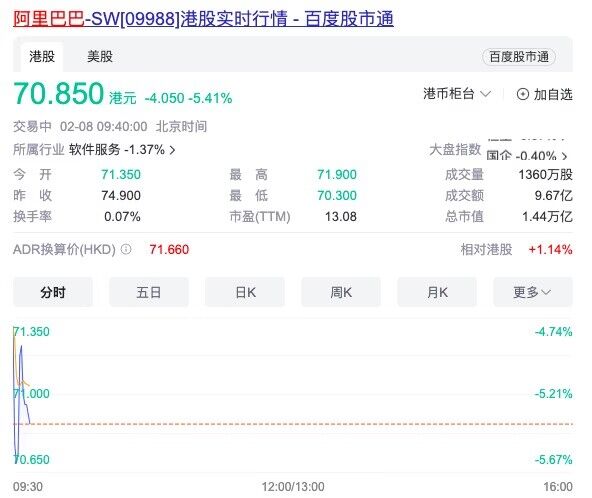 2月8日消息,港股今日開盤,阿里巴巴股價下跌3.55%,截至發稿股價跌5.41%,報70.85港元/股。