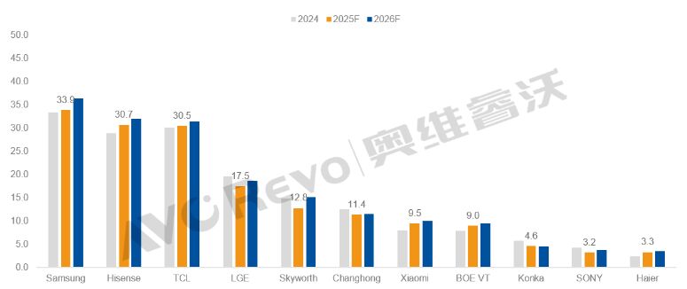 近日,行業(yè)知名數(shù)據(jù)機構(gòu)奧維睿沃(AVCRevo)發(fā)布了各主流彩電品牌2026年電視面板采購目標量。從公布的數(shù)據(jù)來看,盡管明年有世界杯、奧運會等重大體育賽事的刺激和拉動,但受全球經(jīng)濟復(fù)蘇緩慢、消費需求疲軟的影響,各大電視品牌的采購計劃比較“謹慎和保守”。各個電視品牌方對明年市場不追求激進增長,而是以“穩(wěn)住份額、控制庫存”為核心目標。