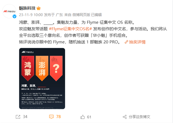 11月9日消息,今日,魅族科技官微宣布,開啟為Flyme征集中文OS名稱的活動。