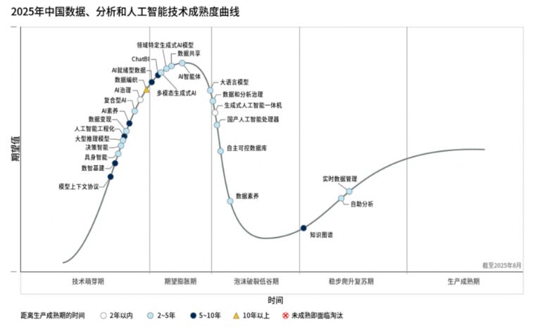 商業(yè)與技術(shù)洞察公司Gartner于近日發(fā)布最新2025年中國數(shù)據(jù)、分析和人工智能技術(shù)成熟度曲線,生成式AI和代理型AI是本技術(shù)成熟度曲線(參見圖一)的兩大核心主題,共同塑造了2025年中國AI發(fā)展的主要趨勢。對于中國的數(shù)據(jù)、分析和AI領(lǐng)導(dǎo)者來說,現(xiàn)在比以往更需要在AI炒作的喧囂中認(rèn)清AI的真正價值,為未來的企業(yè)AI競賽做好準(zhǔn)備。
