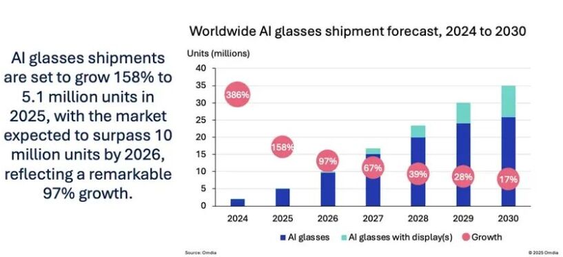 AI眼鏡市場正迎來強勁增長,預(yù)計2025年全球出貨量將激增158%,達到510萬臺。Omdia的最新研究顯示,在谷歌、小米等頭部消費科技廠商加速入局的推動下,該市場預(yù)計在2026年突破1000萬臺,到2030年將達到3500萬臺,2025至2030年復(fù)合年增長率(CAGR)高達47%。