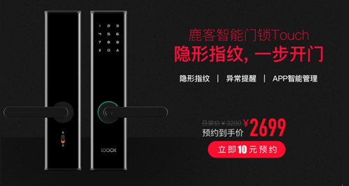 近日,云丁科技為喜迎元旦,為新老客戶提供新年禮物,正式宣布旗下品牌鹿客智能門鎖將聯合天貓,于2018年1月8日-11日上線“天貓超級品類日”#我就不想帶鑰匙#智能門鎖專場活動,用戶可在12月18日-1月9日期間通過“10元預約”方式,搶先預購,以2699元的價格購買原價3299元的鹿客Touch智能門鎖。