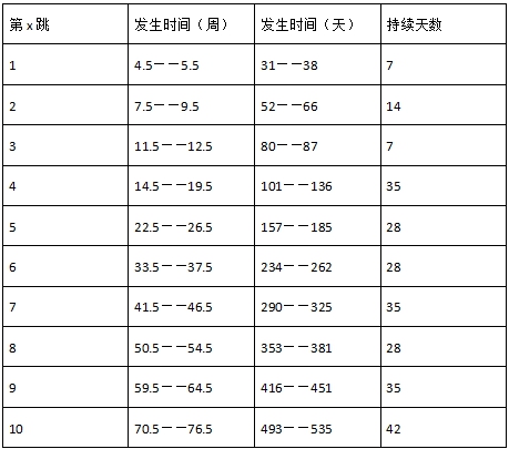 大腦跳躍期則是指寶寶腦發育過程中的10個跳躍式的高峰期,這期間寶寶會比平時更易怒、暴躁、黏人、難哄,甚至影響到食欲和睡眠。在每一跳結束后,寶寶會掌握更多的新技能,帶給你很多驚喜。跳躍期會與大運動發展期有部分重合。具體發生時間參見下表,比如第一跳發生在4.5——5.5周(31-38天),天數計算以預產期為準。