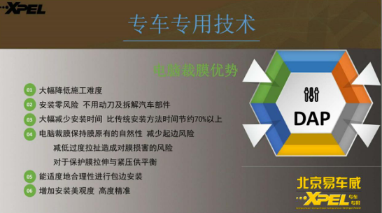 XPEL品牌從創(chuàng)建至今已走過20多年的輝煌,而作為XPEL品牌創(chuàng)始者的美國XPEL科技公司在20年里只專注做一件事——研發(fā)、生產(chǎn)高品質(zhì)車衣。最終,XPEL公司成為車衣行業(yè)的標桿企業(yè),擁有眾多專利技術,所研發(fā)的“DAP”專車專用電腦裁剪軟件大大提升了車衣切割效率,無需人工下刀,使車衣剪裁更為精準。