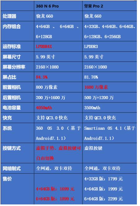 通過上述表格,我們明顯可以看出,360手機N6 Pro、堅果Pro2在售價方面存在不少差異。其中360手機N6 Pro 4+64GB、6+64GB和6+128GB三種內存版本的售價分別為1699元、1899元、2399元,而堅果 Pro 2對應版本的售價分別為1999元、2299元和2699元,差價高達300-400元。那么這么的差價,是否意味著堅果Pro 2有配置方面更優勝,能給用戶帶來更強悍的使用體驗?答案不容樂觀。