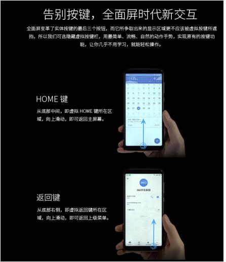 目前,全面屏機型采用的按鍵方式主要有兩種,一種是堅果 Pro2所使用的傳統的虛擬按鍵方式,一種是360手機N6 Pro搭載的虛擬手勢模式。二者的主要差異在于,虛擬手勢模式能最大限度保留全面屏的可視空間,彰顯全面屏的視覺優勢,在實際操作過程中,能夠給用戶“無邊際”的震撼體驗。而傳統的虛擬按鍵方式由于要占用一定的屏幕空間,在相同屏幕尺寸的前提下,會大幅度降低顯示屏的可視區域,因而在一定程度上影響用戶的視覺體驗。