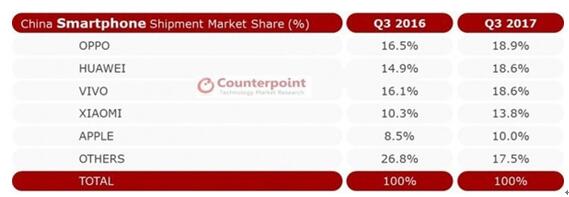 在市場走低的情勢下,以OPPO為代表的國產手機,相比2016年,仍然呈現上升勢頭。據Countpoint 2017年第三季度數據顯示,OPPO以18.9%的市場占有率問鼎中國手機市場份額第一,實現了逆勢增長。