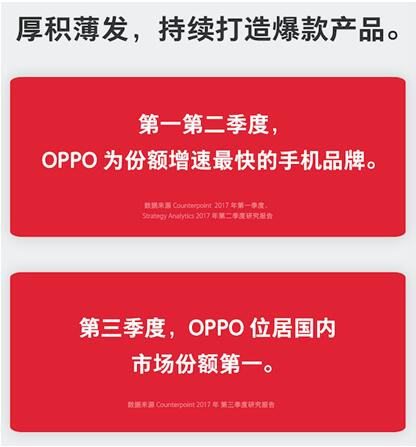 OPPO的逆勢增長在外界看來,主要得益于OPPO產品的熱銷。在2016年,OPPO兩款爆款機型R9和R9s表現強勢,R9s更是成為2017年第一季度全球最暢銷單品。2017年,R11一上市便受到眾多年輕人歡迎,成為7月份全球最暢銷安卓機型,R11s開售30分鐘即成為京東天貓蘇寧2500-3000元價位最暢銷機型。得益于R系列的持續暢銷,OPPO也成為第一季度和第二季度份額增速最快的手機品牌,為OPPO在第三季度登頂國內市場份額第一打下堅實的基礎。