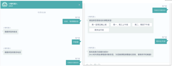 如用戶提問 “我要報名” ,機器人會主動發問 “您的姓名” 、“聯系電話”及“報名課程類型”,用戶說依次回答后,在當前的交互頁面完成了報名。
