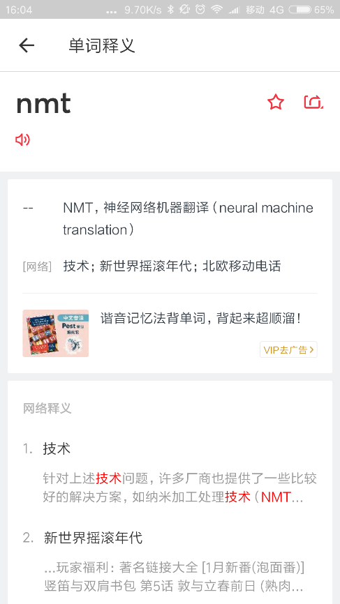 與很多僅有簡單查詞功能的手機內置詞典相比,有道詞典的優勢不言而喻:十年技術積累、龐大的用戶群體、推陳出新的技術和良好的用戶體驗。同時,有道系產品如有道詞典、有道翻譯官等應用已全面上線了有道神經網絡翻譯技術,通過人工智能對翻譯的改造,讓翻譯質量獲得了大幅提升。