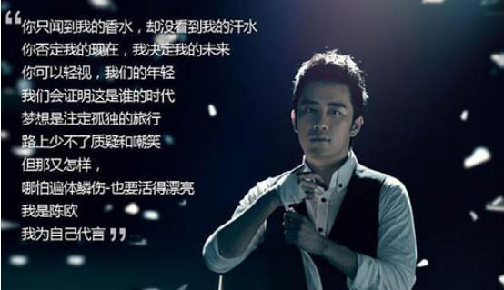2012年,一則名為《我為自己代言》的廣告大片在各大主流媒體和新媒體上播出后引起了巨大的反響,尤其受到八零后、九零后青年人的熱烈追捧,其中的廣告語是這樣的:“你只聞到我的香水,卻沒看到我的汗水。你有你的規則,我有我的選擇。你否定我的現在,我決定我的未來。你嘲笑我一無所有 ,不配去愛,我可憐你總是等待。你可以輕視我們的年輕,我們會證明這是誰的時代。” 夢想是注定孤獨的旅行,路上少不了質疑 和嘲笑,但那又怎樣,哪怕遍體麟傷,也要活得漂亮!”這則廣告大片就出自聚美優品,其中稱“我為自己代言”的陽光帥氣有明星相的大男孩就是聚美優品CEO陳歐。