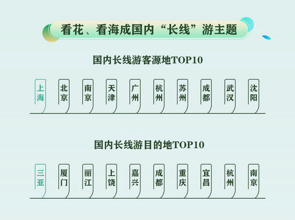 途牛旅游網監測數據顯示,截至3月22日,預訂清明節國內長線游產品的人次占預訂總人次的比例約為30%,預訂出游人次排在前十的客源地分別為上海、北京、南京、天津、廣州、杭州、蘇州、成都、武漢、沈陽;國內長線游人氣目的地前十名包括三亞、廈門、麗江、上饒、嘉興、成都、重慶、宜昌、杭州、南京,看花和看海成為國內游兩大主題。