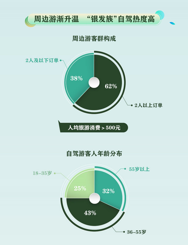 值得一提的是,自駕出游已不再是年輕人的專利,2018狗年春晚小品《學車》,便表達了全國銀發族對自駕出游的渴望。途牛旅游網監測數據顯示,2018年清明小長假,在預訂自駕游產品出游的客人中,55歲以上銀發族人次占比超過32%。節奏較為舒緩的“周邊景點+酒店”兩日自駕游行程受到銀發族歡迎。