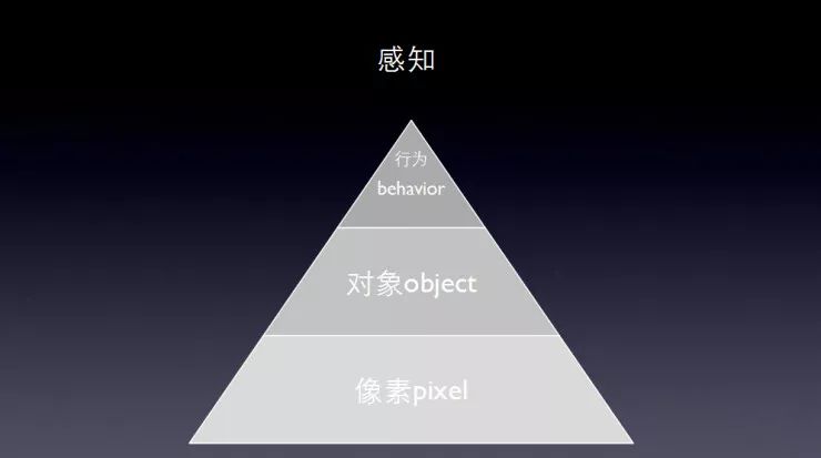 這里有一個金字塔的描述,最底層是像素,中間層是對象,再上一層是行為。