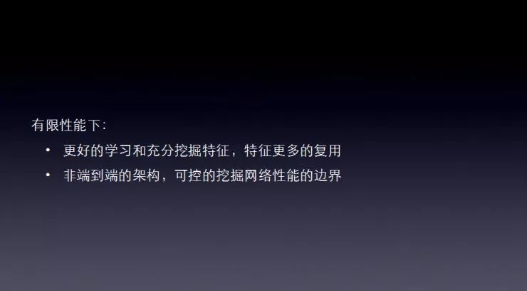 因為算力不夠,在有限的性能下,我們的假定有兩點:一是更好地學習和充分挖掘性能特征,并且在一個產品上,我們對這些特征在不同的環節更好地復用,可以大大降低計算的復雜度;二是非端到端的架構,在產品里面我們對每一步、每一個環節是可控的,在這個可控的基礎上一步步優化和挖掘網絡性能的邊界。這是在算法上我們的一些嘗試和心得。