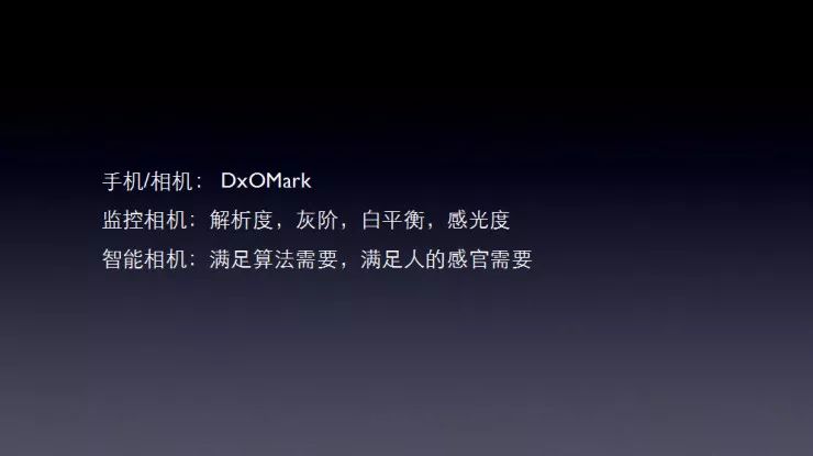 成像方面,比較難的問題是智能相機的成像評測是沒有標準的,如果有標準的話,大家工作的方式就是朝這個標準努力,比如說手機相機有一些專業的評測機構定下了一些標準,安防相機也會有一些指標,比如說解析度、灰階、白平衡等等。但是智能相機的標準是什么呢?我們的成像什么樣才算好的?最后我們定出了一個標準,首先我的成像要滿足算法的需要,其次再來滿足人的感官需要。這是一個很主觀的概念。