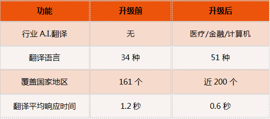 其次是方言功能的升級:在粵語、東北話、四川話、河南話和英語翻譯的基礎上,此次升級新增了普通話和粵語的互譯,這就解決了消費者在香港、澳門等粵語地區可能會遇到的溝通問題。第三則是翻譯機技術的升級:翻譯平均響應速度縮短,從原先的1.2秒提升至600毫秒,速度更快更高效了。