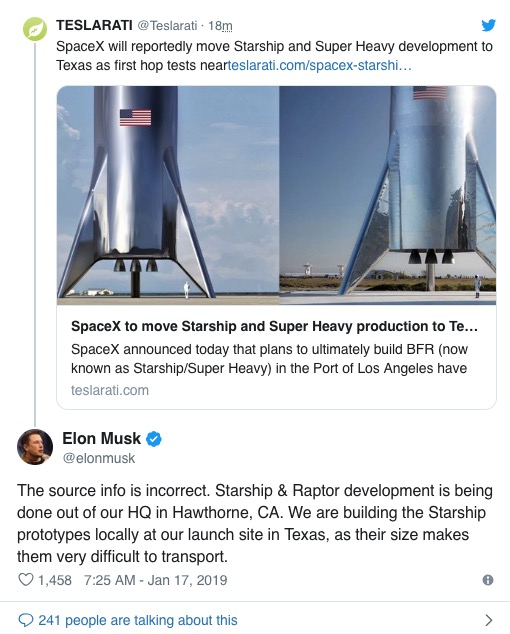 SpaceX CEO埃隆·馬斯克(Elon Musk)隨后在Twitter上澄清稱,星際飛船和猛禽發動機依舊在霍桑總部開發,在德州生產的是星際飛船原型機,因為它的體積龐大難以運輸。