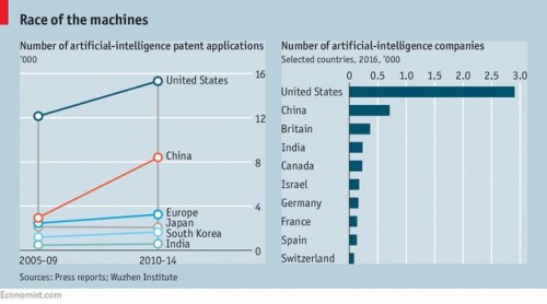 2016 年 10 月,白宮的一份報告指出,在人工智能的分支深度學習方面,中國發表的相關期刊文章已然超越了美國。咨詢公司普華永道預測,在 2030 年之前,與人工智能相關的發展將會促使全球 GDP 增長16億美元;據估計,近一半的財源都將累積至中國。盡管美國在絕對數量上仍然領先,但近幾年來,中國研究人員所提交的人工智能相關的專利申請數量增加了近 200%。
