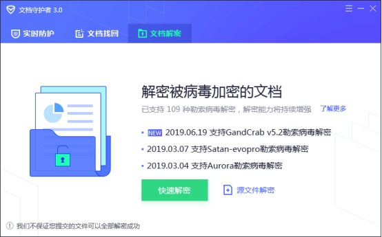 此外,針對勒索病毒的危害,騰訊安全在騰訊電腦管家和騰訊御點終端安全管理系統上推出文檔守護者功能,提供了一套相對完善的數據備份恢復方案,幫助用戶解密數據。2019上半年,有數千萬用戶啟用了內置的文檔守護者功能,內置的自研解密方案成功為上千名勒索病毒受害者提供了解密服務,并幫助受害用戶成功恢復加密文件。