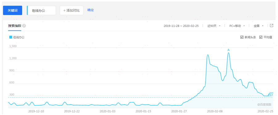 在此背景下,“云開工”一躍成為當(dāng)下主流,而國人對于“在線辦公”的關(guān)注與需求都呈井噴態(tài)勢,這從百度指數(shù)搜索曲線走勢中即可反映出來(見下圖)。