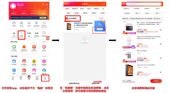 領券成功后,打開京東app點擊首頁下方“我的”標簽頁,即可在“優惠券”選項中找到剛剛領取的北京消費券,選擇立即使用就可以查看可用北京消費券的商品啦~怎么樣,是不是超級簡單、一學就會!