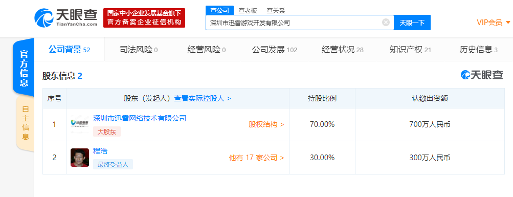 天眼查股權結構顯示,深圳市迅雷網絡技術有限公司為該公司大股東,持股比例70%;迅雷創始人程浩為第二大股東,持股比例30%。