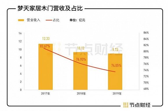 具體到產(chǎn)品方面,于上述報告期內(nèi),夢天家居核心產(chǎn)品門扇銷量逐年減少,分別為64.6萬套、50.95萬套、45.61萬套,兩年少賣近20萬套,銷量降幅高達(dá)30%;對應(yīng)的銷售收入為12.33億元、10.12億元、9.73億元,占公司營業(yè)收入比重為83.67%、76.93%、74.05%。