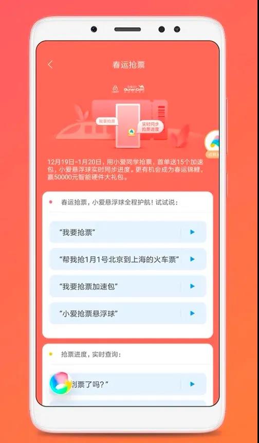 2019年春節,小米營銷與去哪兒網共同發起“AI”上春節活動,借助小愛同學的AI能力,幫助大家減輕搶票壓力。用戶只需說一句話,小愛同學就自動完成了從打開APP到篩選的6步繁瑣操作,最終這款工具成功助力用戶搶票超過50萬張票。