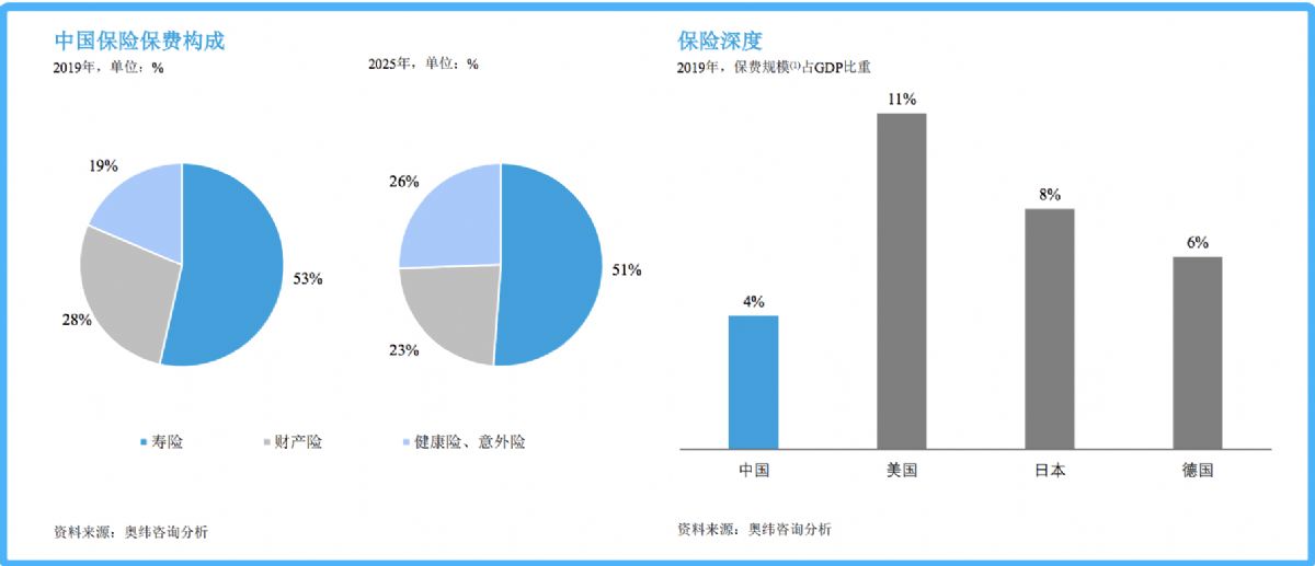 而就保費深度來看,2019年,中國僅為4%,遠低于美國(11%)、日本(8%)和德國(6%)。這也就意味著,中國互聯網保險未來有極大想象空間。