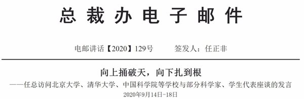 10月27日,華為 “心聲社區”刊發華為公司創始人任正非于9月在訪問北京大學、清華大學、中國科學院等學校與部分科學家、學生代表座談時的發言,題為《向上捅破天,向下扎到根》。