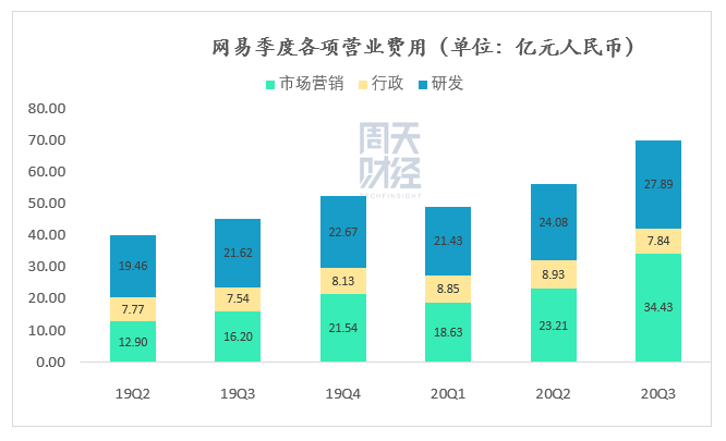 值得注意的是,在高增長表現的同時,網易的營業(yè)費用相比之前有所增高,本季度網易營業(yè)費用達到 70 億元,同比增長 54.7%,也是近年來營業(yè)費用最高的一個季度。雖是峰值,但對比一些互聯網公司網易營業(yè)費用依然處于低位,只是對于一向謹慎的網易來說,這個季度顯得尤其特殊。