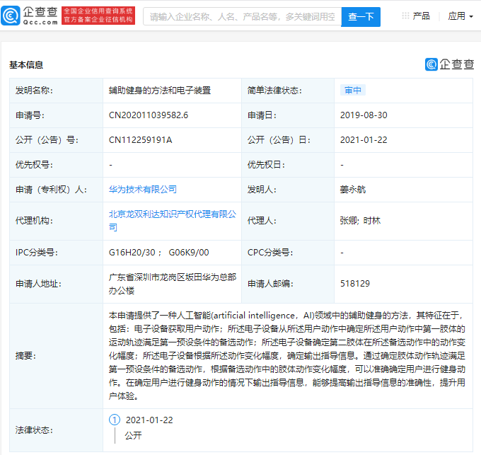 企查查APP顯示,1月22日,華為技術有限公司公開“輔助健身的方法和電子裝置”專利,公開號為CN112259191A。該專利摘要顯示,本申請提供了一種人工智能領域中的輔助健身的方法,通過確定肢體動作軌跡滿足第一預設條件的備選動作,根據備選動作中的肢體動作變化幅度,可以準確確定用戶進行健身動作。在確定用戶進行健身動作的情況下輸出指導信息,能夠提高輸出指導信息的準確性,提升用戶體驗。