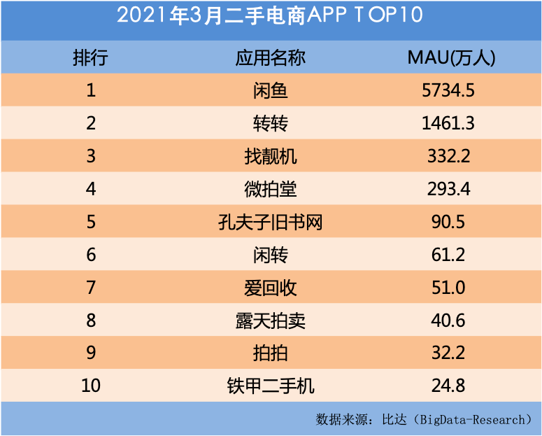 據阿里集團官方數據,閑魚2020財年GMV超過2000億元,賣家超過 3000萬。比達數據的統計指出,在按月活計算的排行榜上,閑魚2021年3月MAU以5734.5萬人超過了后面九大平臺之和,電商的經營根底讓閑魚遙遙領先。