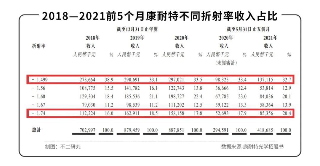 招股書中,康耐特稱其為國內少數能夠供應1.74折射率的樹脂鏡片制造商,2018-2021年前5個月,1.74折射率鏡片的在同期標準化鏡片的收入占比為16%、18.5%、17.8%、20.4%。