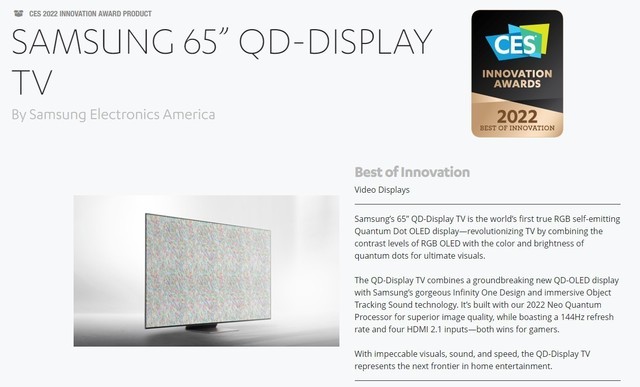 三星對全球電視市場的統治力是毋庸置疑的,常年30%左右的市占率是鐵證。三星也是電視技術的積極探索者,CES 2022開展前,三星電子首款QD-OLED面板電視便已經成為最受行業關注的產品之一,甚至CES官網已經將“最佳創新獎”的頁面發布了。