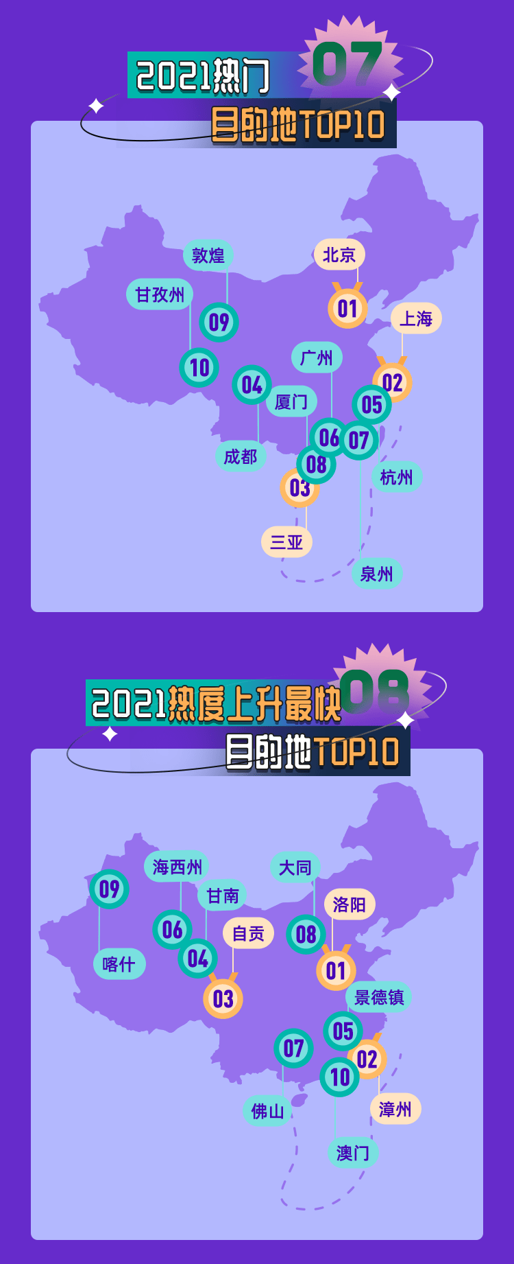 年度十大熱門目的地中,北京、上海、三亞位居前三,同時又一批城市正在成為窮游用戶的新選擇。“半城煙火半城仙”泉州、“海上花園”廈門、“文化圣殿”敦煌、“丁真故鄉”甘孜州首次上榜。而熱度上升最快的目的地中,十三朝古都洛陽位列第一,“土樓王國”漳州緊隨其后,自貢憑借中華彩燈大世界被人熟知,坐擁中國火星模擬基地的海西州同樣吸引了人們的目光,佛山則以“樸素外表”的機場頻繁出圈。