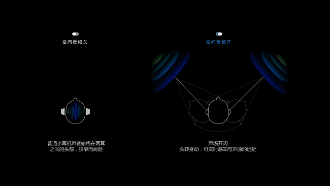 借助耳機(jī)內(nèi)置的陀螺儀與頭部追蹤 3D 音頻處理算法,實(shí)時(shí)跟蹤頭部姿態(tài),真實(shí)感受與固定聲源之間的遠(yuǎn)近距離聽感,聽歌如臨 Livehouse 般的臨場(chǎng)感,看片也有影院級(jí)逼真體驗(yàn)。