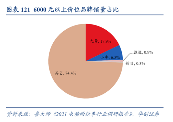 《魯大師2021年兩輪電動(dòng)車行業(yè)調(diào)研報(bào)告》顯示,目前6000元以上價(jià)位產(chǎn)品的品牌銷量中,九號(hào)公司占比為17.9%,小牛電動(dòng)占比為6.5%;雅迪占比為0.9%;新日占比為0.3%;愛瑪未進(jìn)入榜單。