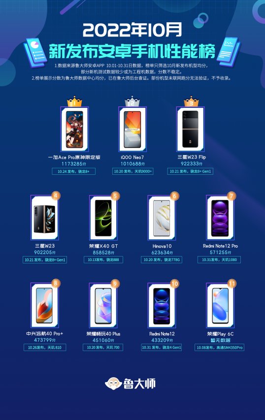 魯大師數據中心公布了10月安卓新發布手機性能、流暢度排行榜,數據來自魯大師APP 10.01日-10.31日的數據,榜單只篩選在這期間新發布的機型。部分新機測試數據較少或為工程機數據,分數不穩定。