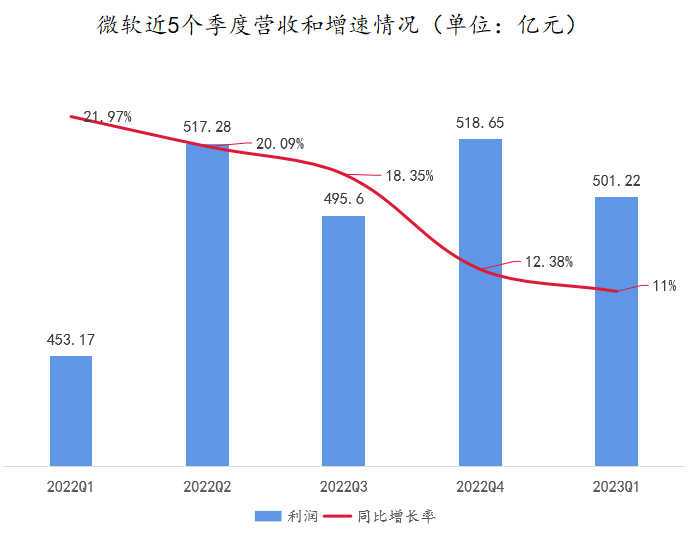 近日,微軟發(fā)布了2023財年一季度最新財報。財報顯示,微軟本季度營收為501.22億美元,雖同比增長11%,高于此前市場預測的9.4%,但依然創(chuàng)下了自2018財年以來的最低增長記錄。
