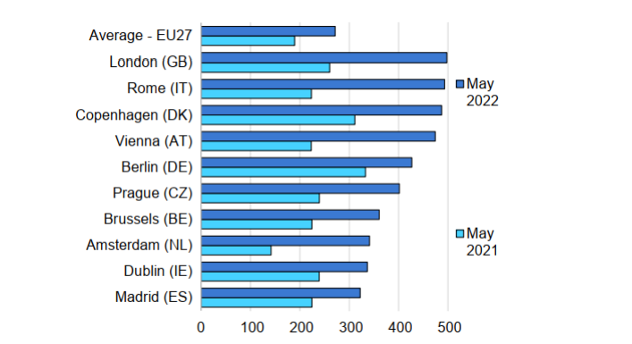 由于數(shù)據中心為典型的電力密集型行業(yè),但不斷上漲的能源價格正在增加其運營費用。其中,微軟Azure在歐洲地區(qū)分布著11個大型數(shù)據中心。而從后續(xù)歐洲的電力價格來看,依然呈現(xiàn)上漲趨勢。