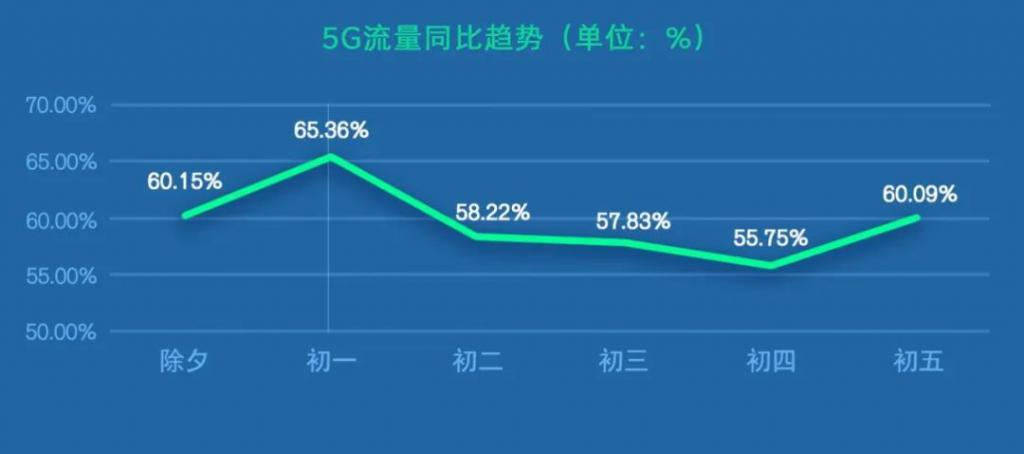 從網絡流量維度來看,全國 5G 日均流量同比(同比:與 2022 春節數據相比,以下表述含義相同)提升 60% 左右,除夕當天流量達到春節期間最高值,同比提升超過 60%。