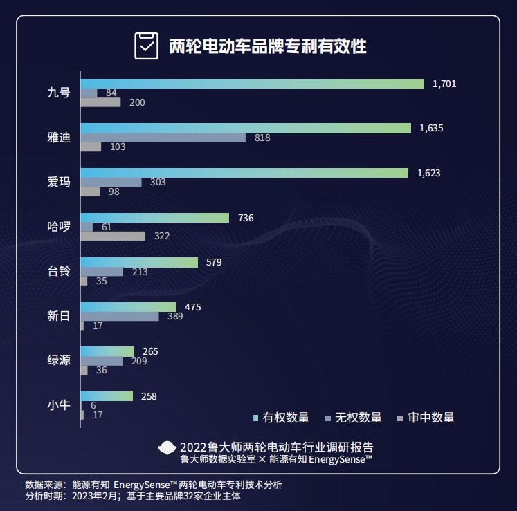 實用新型專利屬于較為實用、但價值次于發明的專利技術,兩輪電動車行業大部分品牌都擁有較多實用新型專利,反映出兩輪電動車研發上較多的技術是對于現有技術的改進運用。