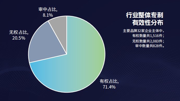 主要品牌專利有效性方面,整體來看大部分技術專利處于有效狀態(71.4%),無權專利占比20.5%,另有8.1%在審中。