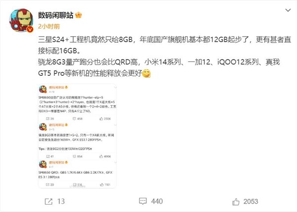 據知名數碼博主@數碼閑聊站 最新發布的信息顯示,與此前曝光的消息基本一致,全新的三星Galaxy S24系列將繼續包含Galaxy S24、Galaxy S24+和Galaxy S24 Ultra三個版本,而其在硬件層面最大的亮點莫過于將搭載高通驍龍8 Gen3移動平臺了,結合此前相關爆料,該芯片將采用的是1+5+2架構,由臺積電代工,工藝制程升級至N4P,是迄今為止性能最強悍的驍龍5G芯片。不過與強悍的核心性能形成鮮明對比的是,三星Galaxy S24+的工程機將配備依舊是8GB的內存,對此該博主直言,年底發布的國產旗艦機基本都是12GB內存起步,更有甚者直接標配了16GB內存,而三星旗下的新一代頂級旗艦卻依舊只提供8GB,著實是有些單薄了。