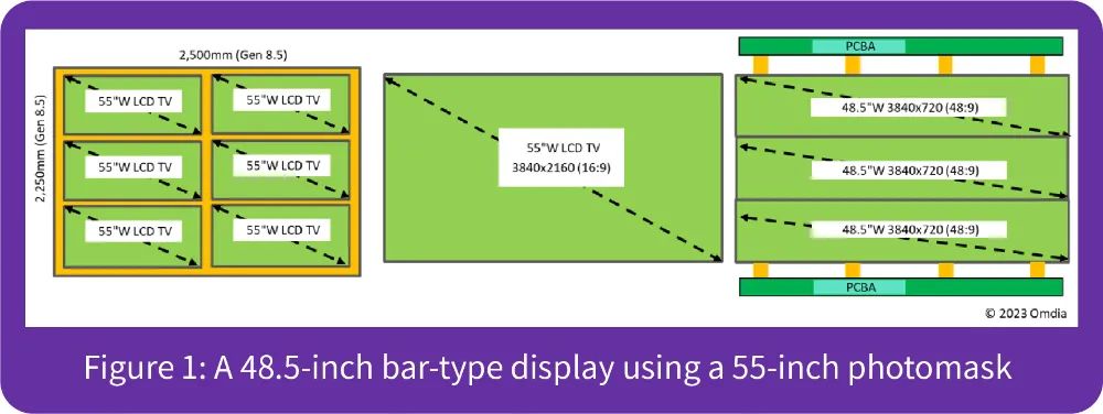 據《Omdia 工業和公共顯示及 OEM 情報服務報告》(Omdia Industrial and Public Display & OEM Intelligence Service) 顯示,以48.5英寸條形屏為例,48.5英寸是55寸面板的三分之一切,而大多數55英寸UHD open cell是在八代線生產,每片母玻璃可生產出6片55英寸open cell,理論上 一片55英寸open cell可以制造出3片 48.5英寸open cell。