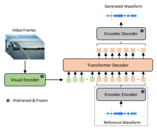FoleyGen 利用現(xiàn)成的神經(jīng)音頻編解碼器在波形和離散標(biāo)記之間進(jìn)行雙向轉(zhuǎn)換。音頻標(biāo)記的生成由單個變換器模型完成,該模型以從視覺編碼器中提取的視覺特征為條件。